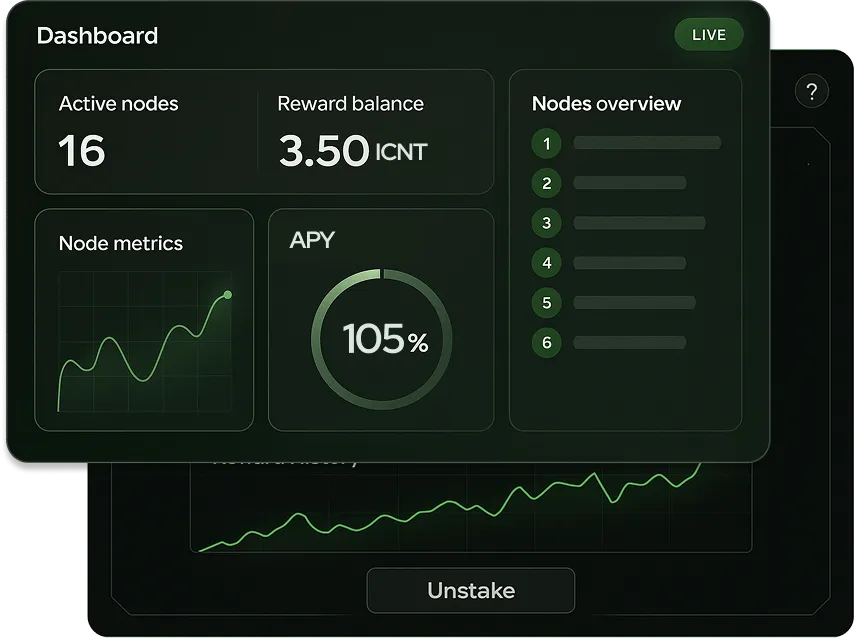 Operators must stake $ICNT as collateral to join the Network and guarantee service reliability and performance. This mechanism enforces integrity via slashing if service levels are breached.